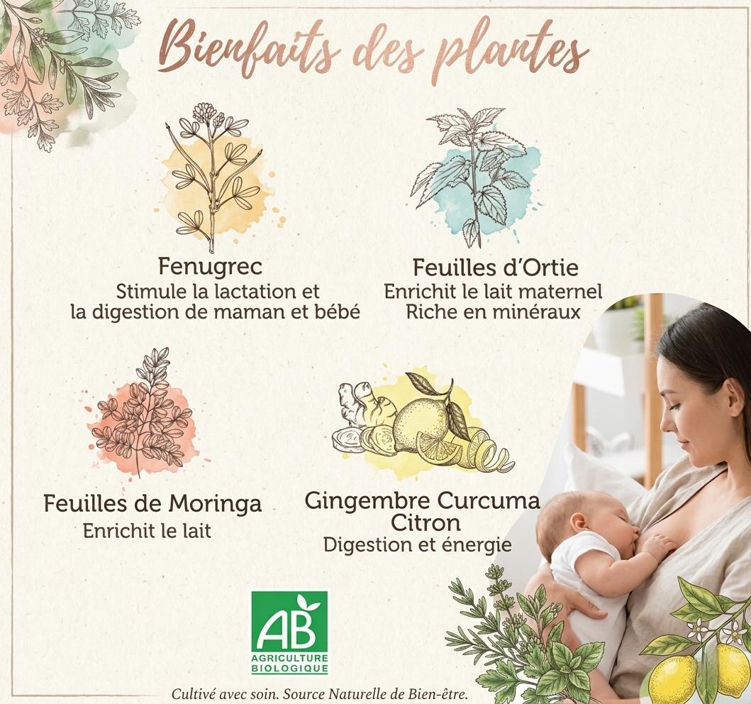 - Nettle leaf: enriches breast milk thanks to its nutritional richness: Iron, Vitamins B and C, minerals (potassium, calcium, zinc, silica)- Moringa leaf: Enriches the milk.